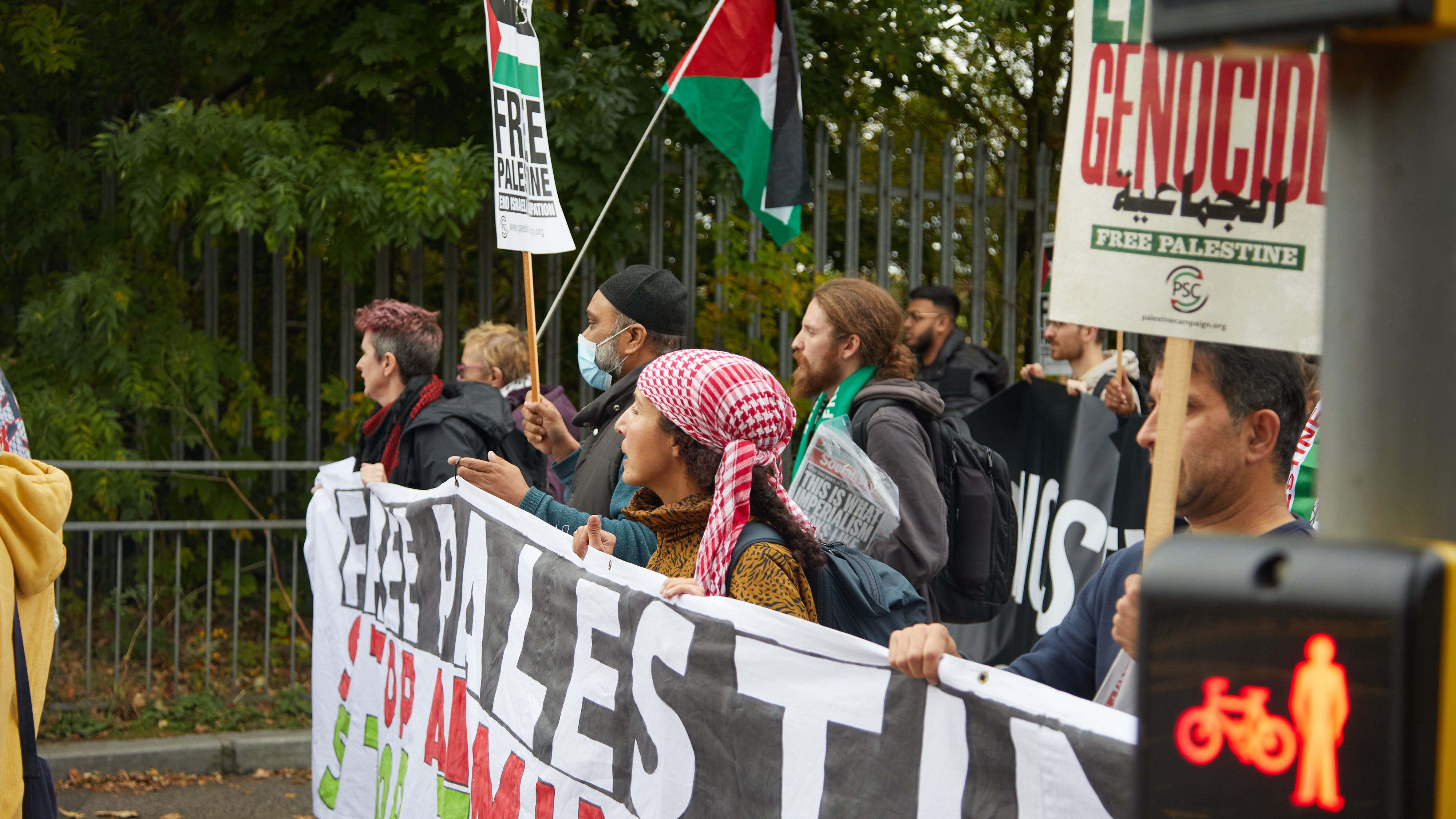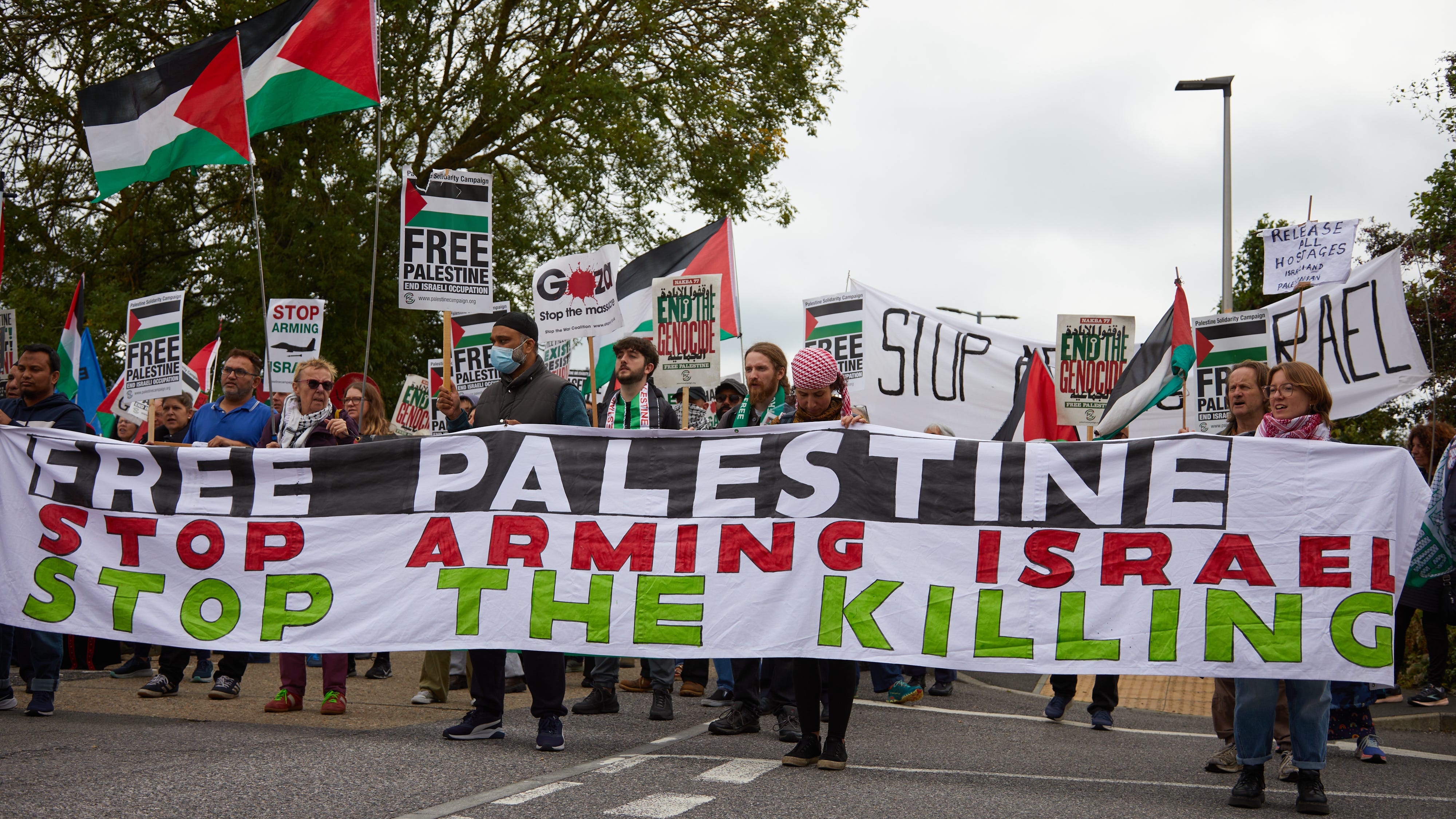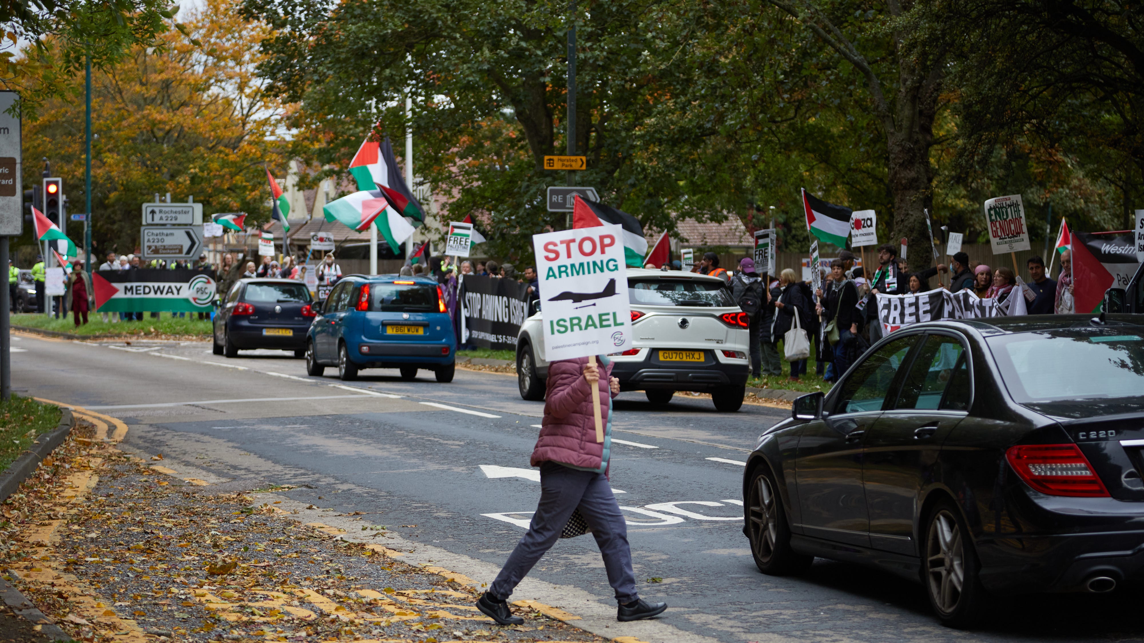 Protesters blocked the gates outside BAE Systems in Rochester last week, Palestinian flags lifting in the wind as around 200 people gathered at the site, calling for an end to UK arms exports used in Israel’s F-35 fighter jets.
