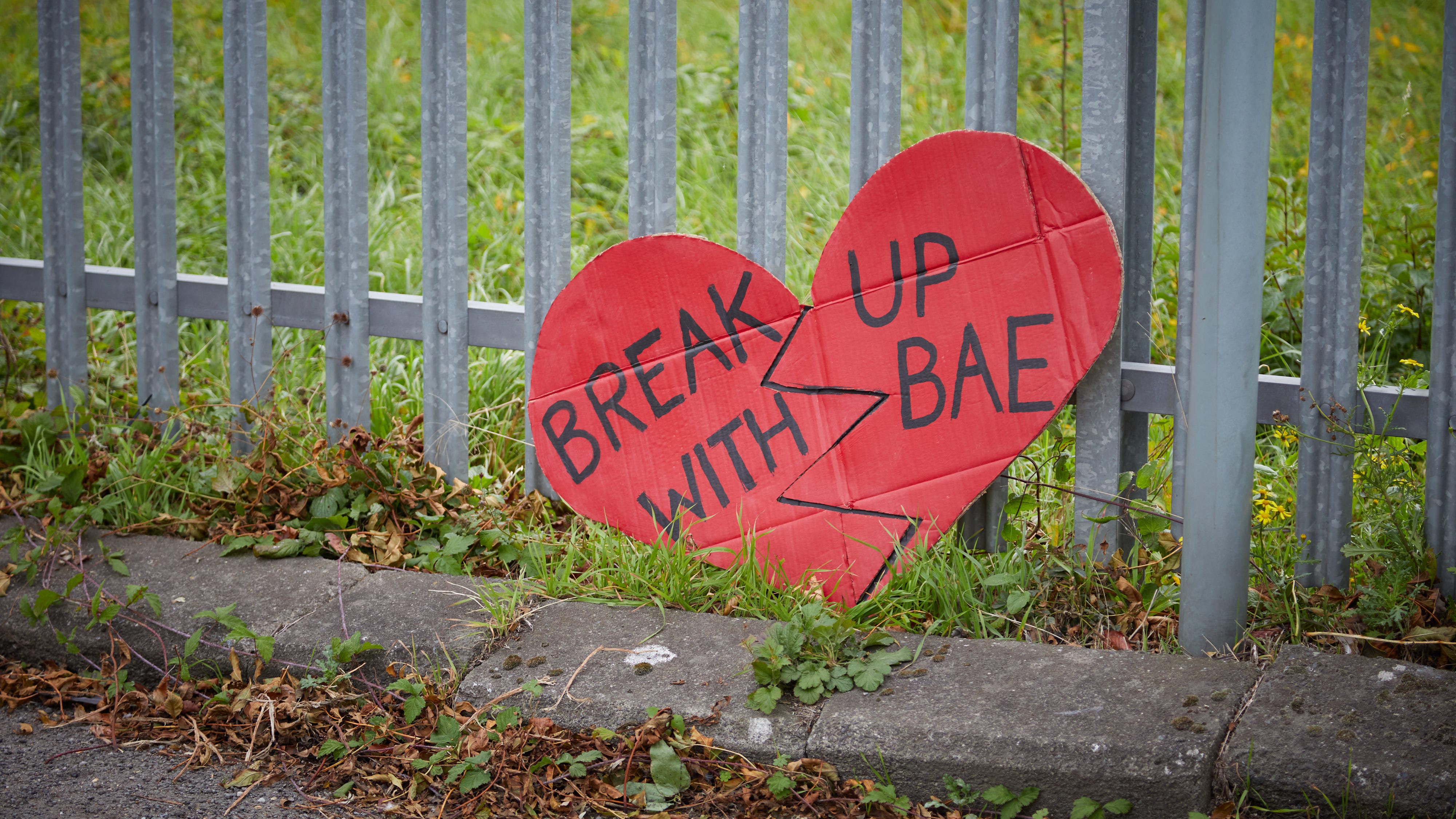 At the gates: The demonstration, organised by Medway Palestine Solidarity Campaign, began outside the Marconi Way entrance before moving to the junction with City Way. Chants of ‘free, free Palestine’ and ‘From the river to the sea, Palestine will be free’ accompanied banners reading End the Genocide and Stop Arming Israel. A red cardboard heart left against the fence read ‘Break Up With BAE.’