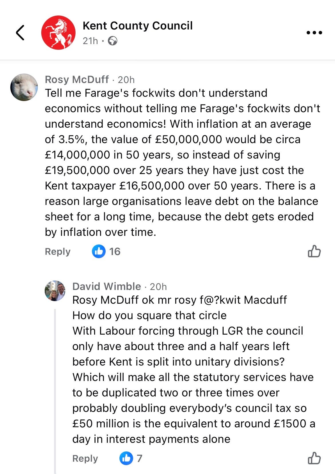 The comment appeared beneath a Kent County Council Facebook post announcing that the authority had paid off £50m of debt, part of efforts to reduce borrowing.