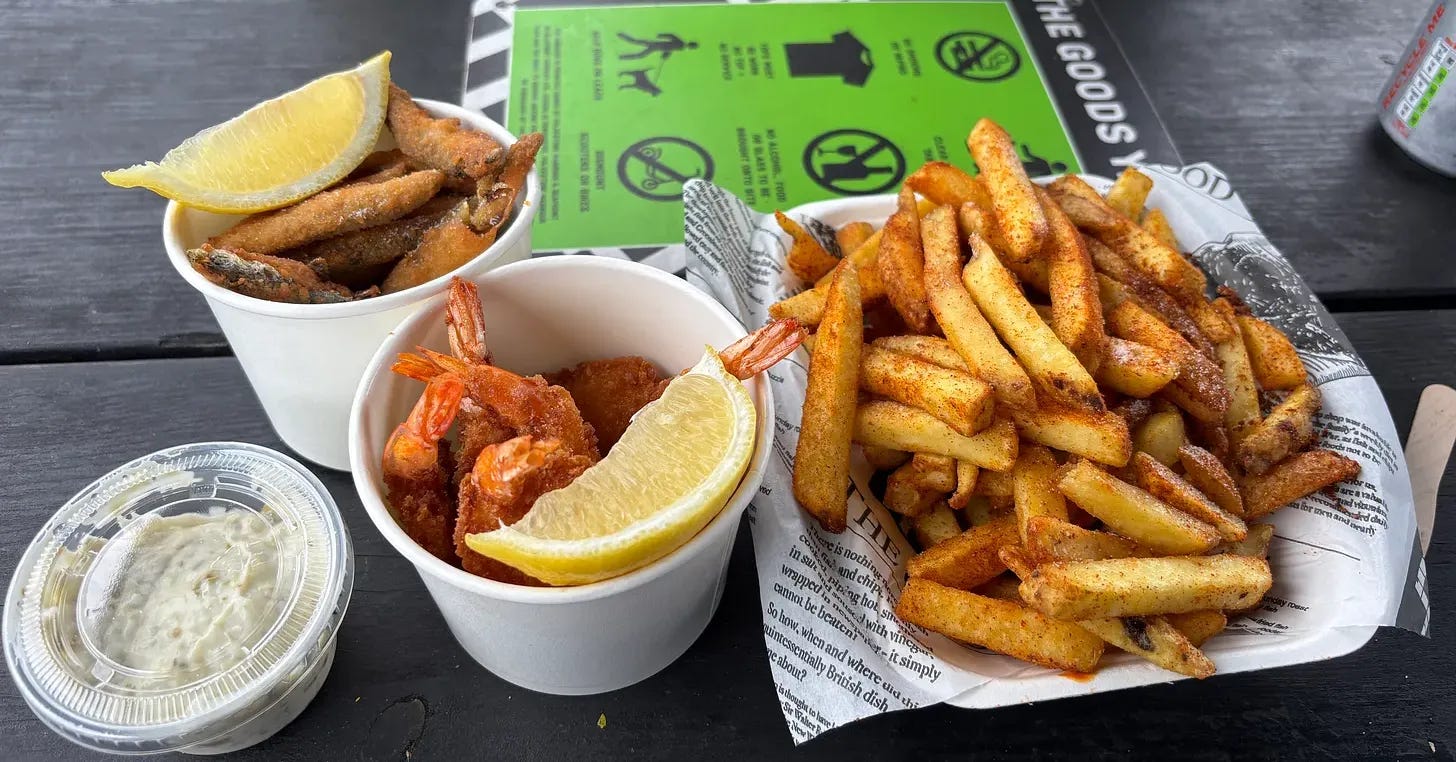 On Folkestone’s impressively revitalised harbour pier, which is worth a visit in its own right, is a food court called The Good’s Yard. It offers a big screen, street food, and a partially covered seating area. Nepalese Street food is on offer, alongside smash burgers, pizzas, and loaded baked potatoes. Having walked this far, with a strong wind blowing in the sea air, it seemed only appropriate to have fish and chips.