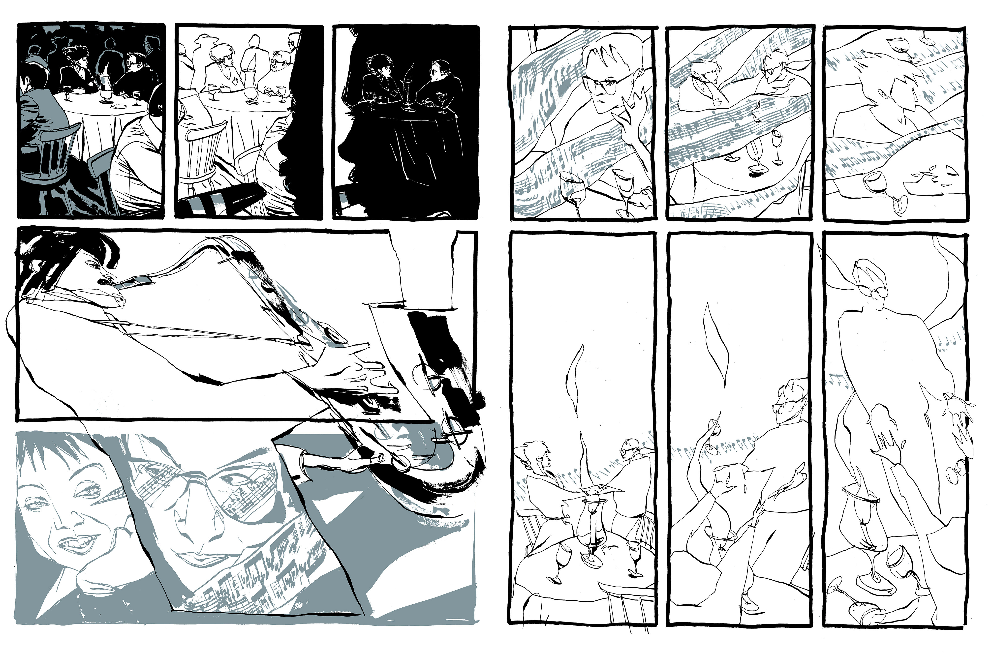 There were two or three scenes where I was trying to do musical comics to see if that would work. And then falling in love and relationships and how that works. I just wanted to see some real people in a book. Also I got a bit tired with very densely illustrated full-colour pages, because although I thought there's no reason why a comic can't be made in any style from very complex, to the simplest of line drawings and everything in between, I did start to think that it slowed the storytelling down and I wanted to do something that was much lighter and easier across the page and your eye just starts to animate those characters across the page. It's a different attitude to it, really.