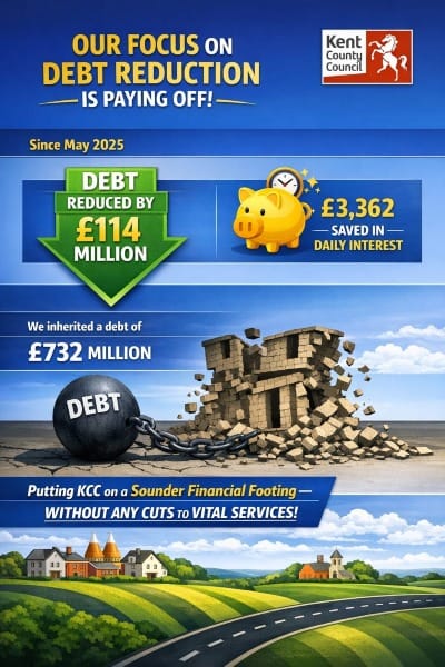 The image claims Kent County Council has 'reduced debt by £114m' and is now saving '£3,362 in daily interest' while doing so 'without any cuts to vital services.' It is being shared by Reform councillors rather than through official KCC channels, but it uses an AI-generated crest and a design style plainly intended to echo the council's visual identity.