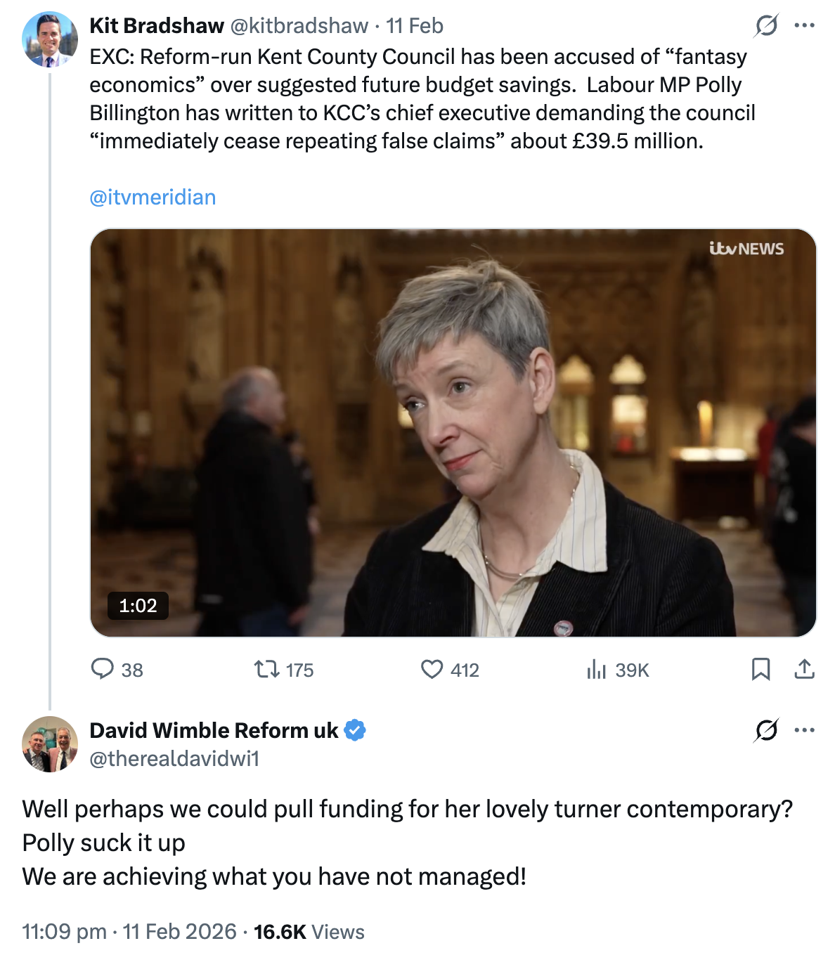 After ITV reported on East Thanet MP Polly Billington’s claim that Kent County Council’s £39.5m 'savings' boast was built on what she called “fantasy economics,” one of Reform’s own cabinet members decided the correct reply was not to publish the paperwork, clarify the language, or do any of the boring local government things a council is meant to do. Instead, David Wimble, KCC’s Cabinet Member for Economic Development and Special Projects, replied on X by suggesting the council could “pull funding” for Margate’s Turner Contemporary, adding: “Polly suck it up. We are achieving what you have not managed!”