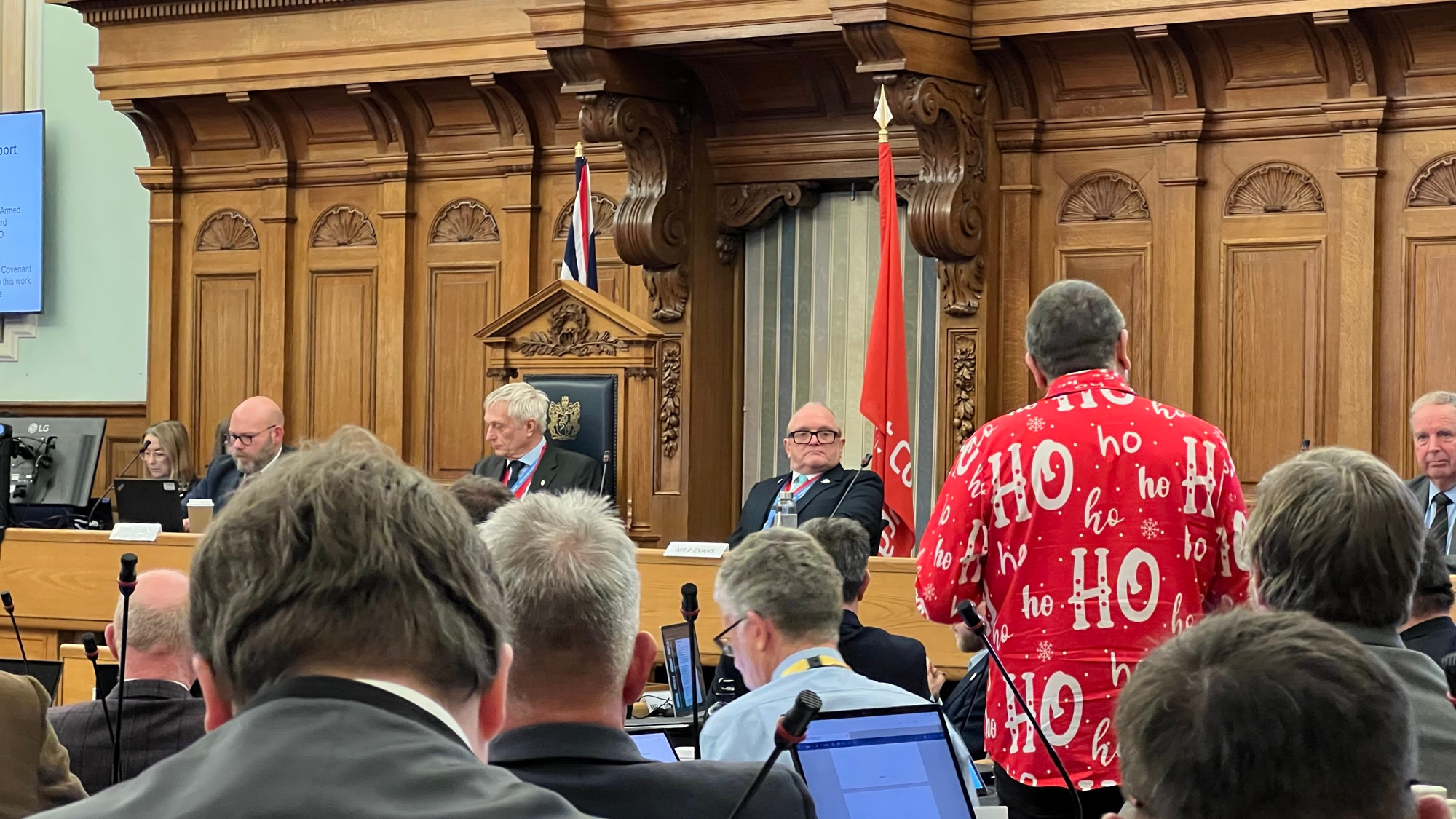 Inside the chamber, in a sea of suits, one councillor stood out. Cllr Tim Prater (Lib Dem) arrived wearing a brightly patterned Christmas jacket, bringing a rare splash of colour to the room.